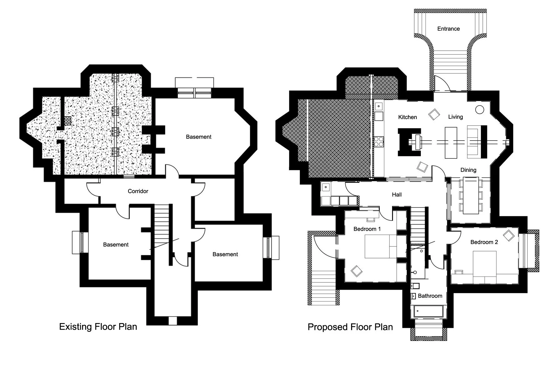 The new spatial arrangement includes two bedrooms, a kitchen, living room area, bathroom, dinning area/snug and utility room. A porous (glazed) wall in the centre of the basement will allow natural light to blead into the whole space from two new doors located in the new living room and bedroom 1. The fire place will house a log burner in the living room and a cooker in the kitchen.
